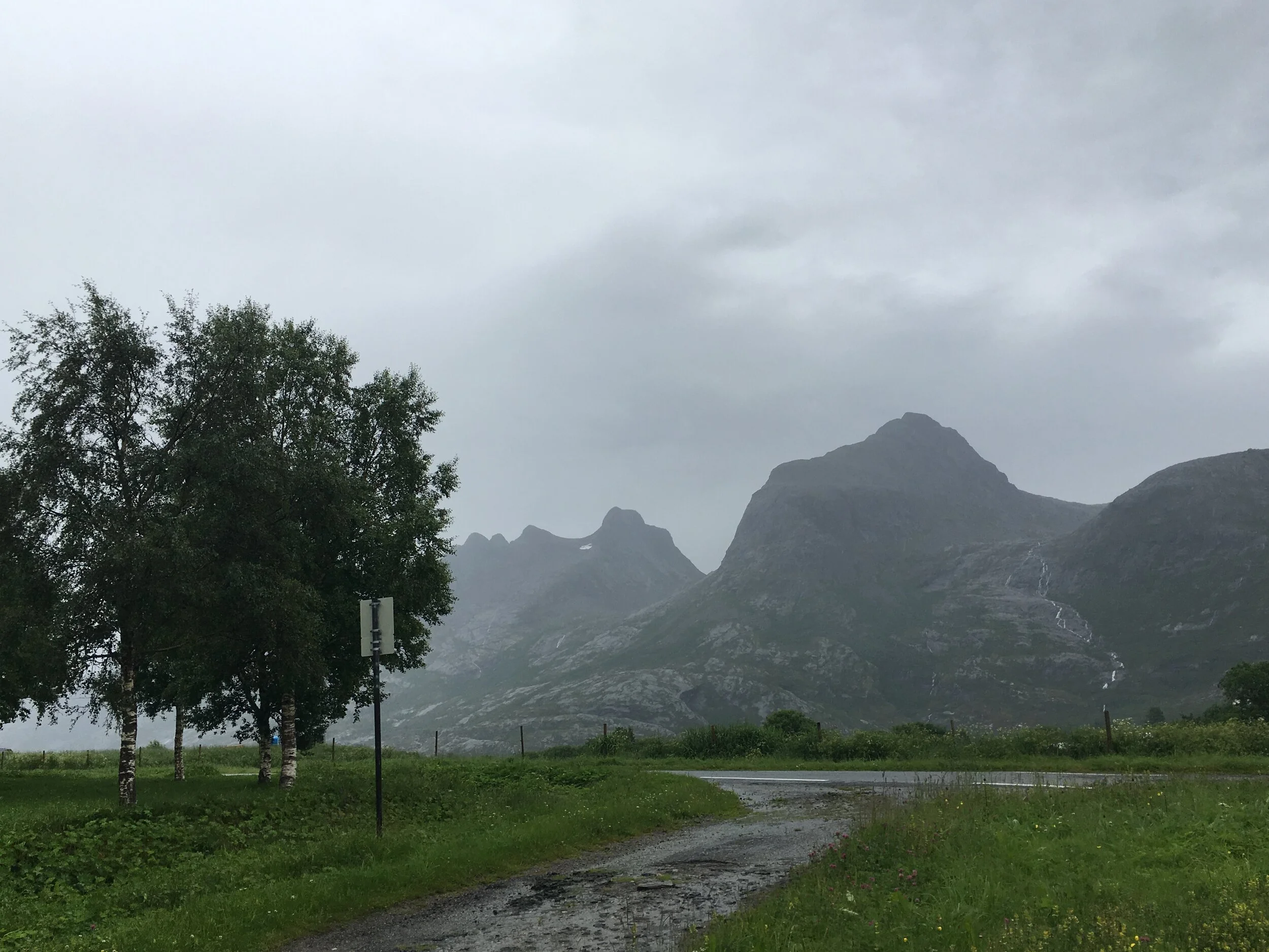 Det var en god del biler på ferga, og med tiltagende styrke på regnet, så tenkte jeg at jeg burde finne meg et husly for natten. Jeg prøvde meg på Vega camping, men ikke overraskende var alle hyttene booket. Den joviale, trivelige og humoristiske innehaveren av campingplassen trakk på skuldrene og sa det også var en fin plass for villcamping litt lengre syd.