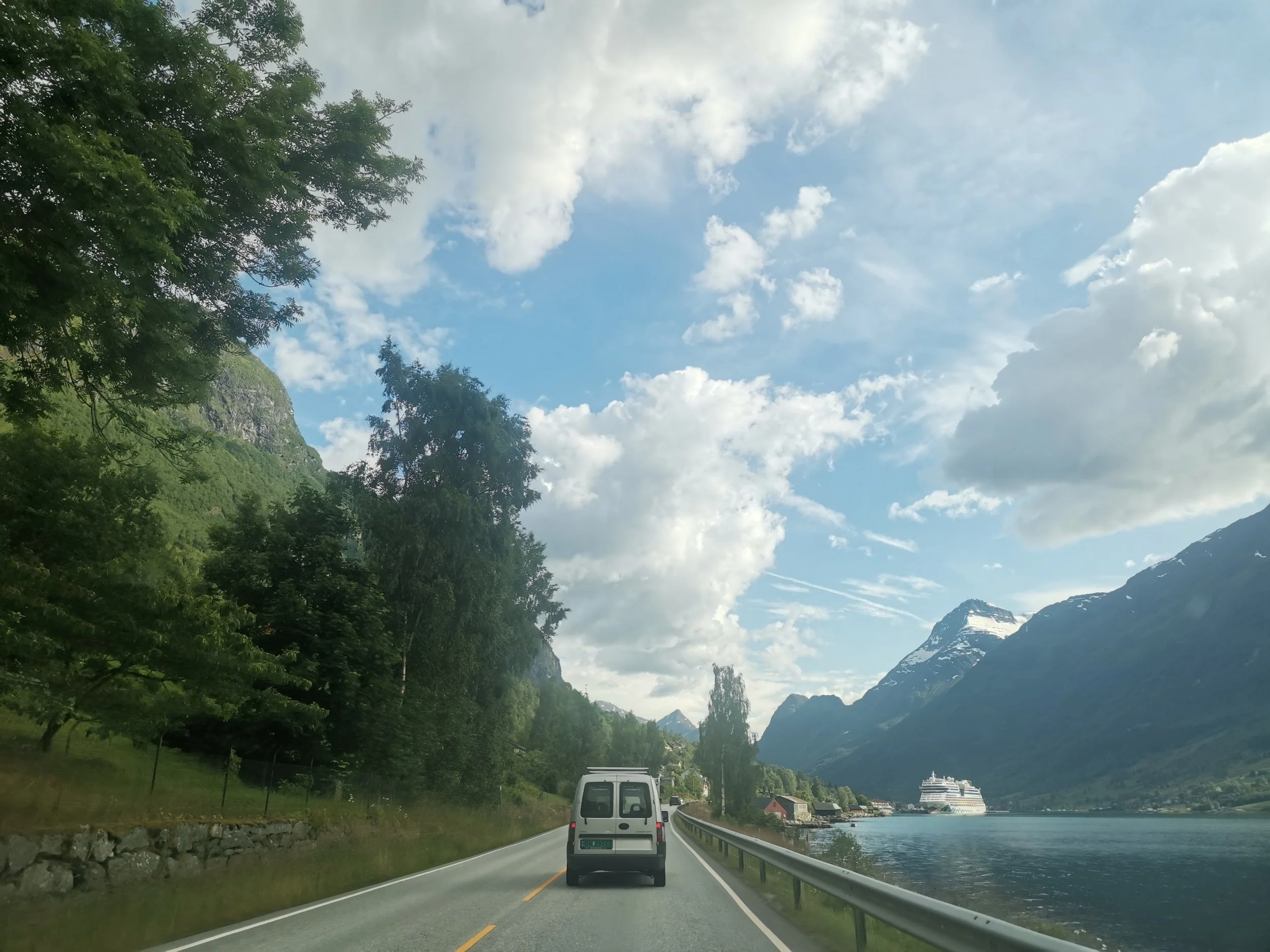 Vestlandet er vakkert. Punktum. Det er alltid en sann glede for en innlending å krysse fylkesgrensa, komme seg over fjellet, og se fjell og fjorder åpenbare seg for øyet. Vi hadde noen byger på turen, men mest av alt fint kjørevær, og nøt utsikten både gjennom Stryn, Loen, Utvik og Innvik - før vi tok fatt på den siste, lille oppstigningen før det bar nedover igjen mot Byrkjelo, Reed og vår destinasjon Sandane.