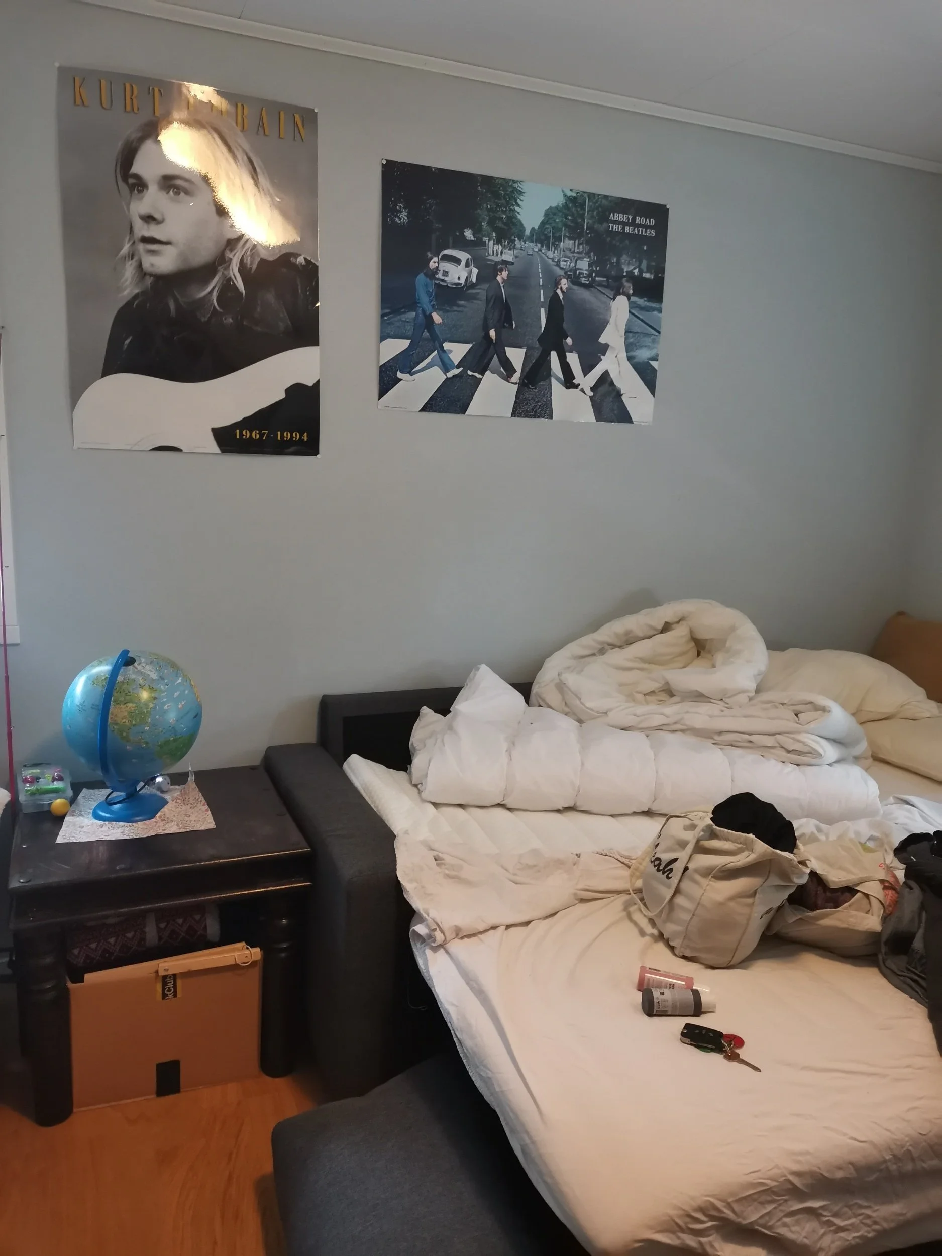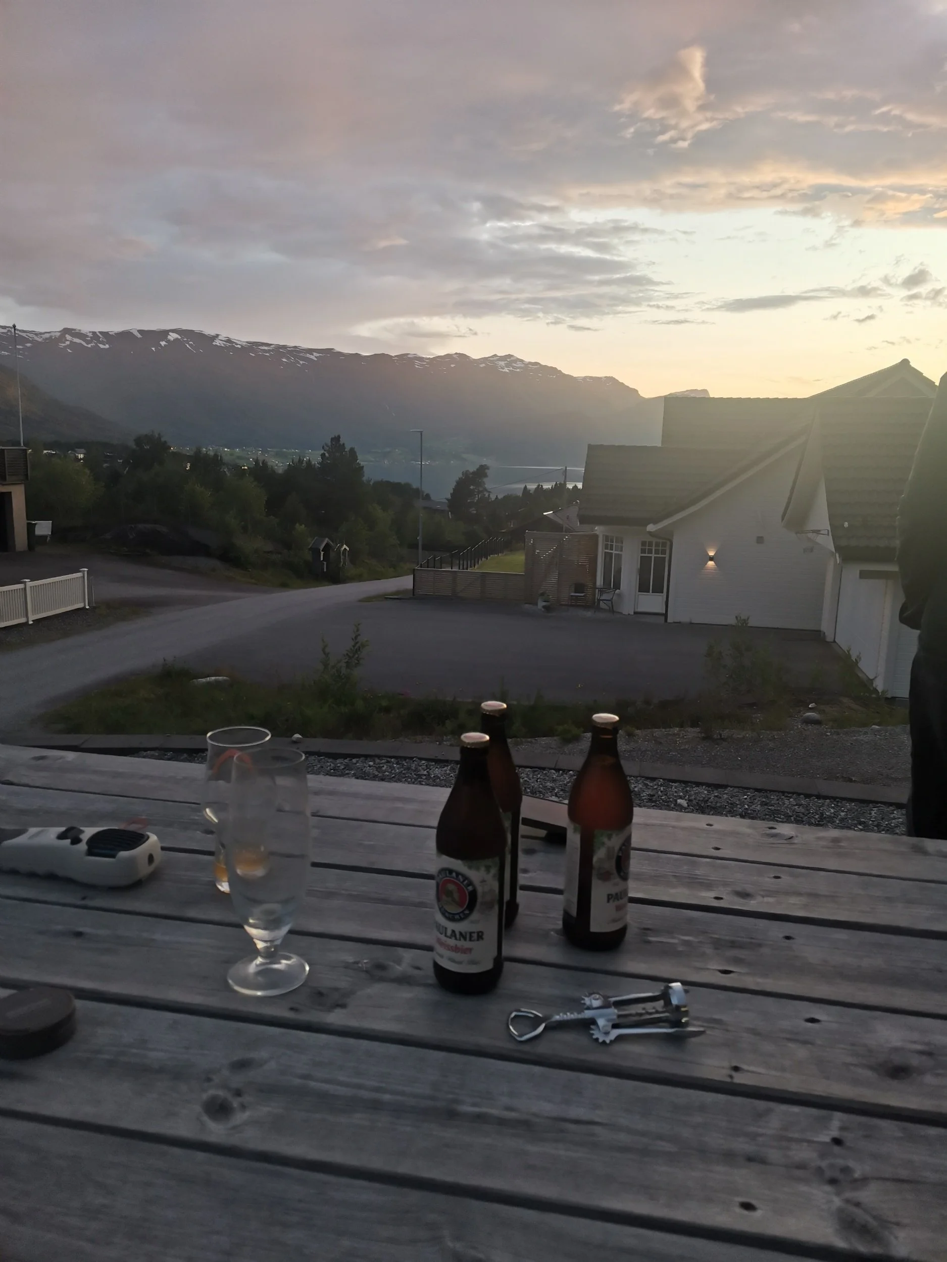 Hverken T eller M hadde ferie enda, så begge måtte opp og leve sitt vanlige liv morgenen etter - men vi koste oss med noen glass godt drikke på plattingen - med en nydelig utsikt over Sandane - til klokka akkurat bikket midnatt. Da var det godt både for de ferierende, og de arbeidende, å legge inn årene for dagen - og krype under dyna på gjesterommet, overvåket av både The Beatles og selveste Kurten.