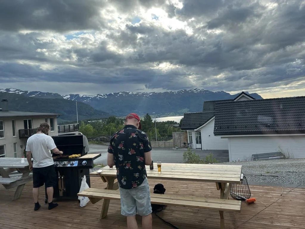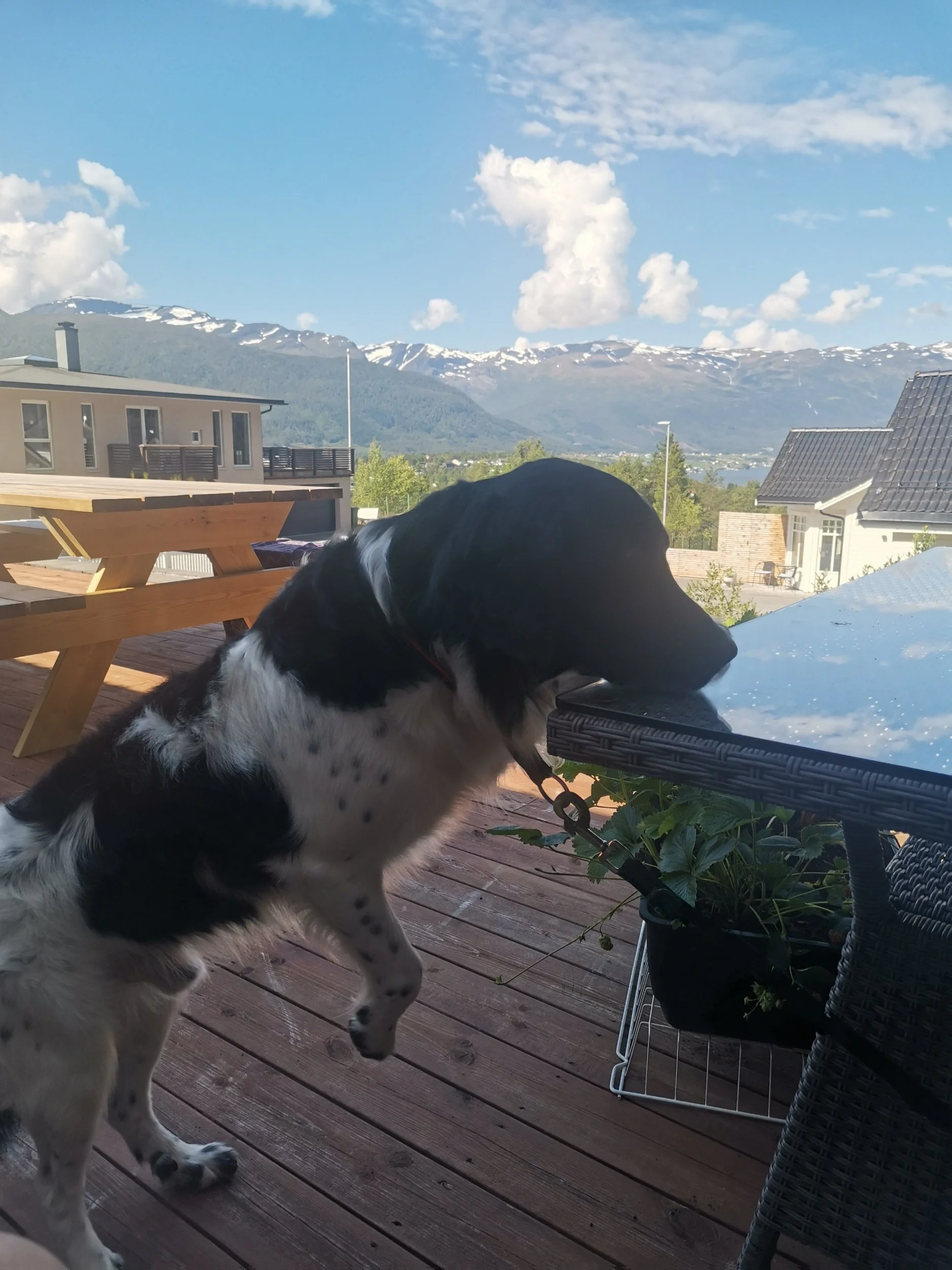 I en nydelig kveldssol svingte vi oss etterhvert oppover Valborgskleiva, på øversiden av hovedveien som passerer Sandane på vei videre mot Nordfjordeid. Der ble vi tatt i mot av både T, M, husets sjarmerende 4-åring L, og ikke minst den svært så entusiastiske hunden Myggen - oppkalt etter fotballspilleren så klart.